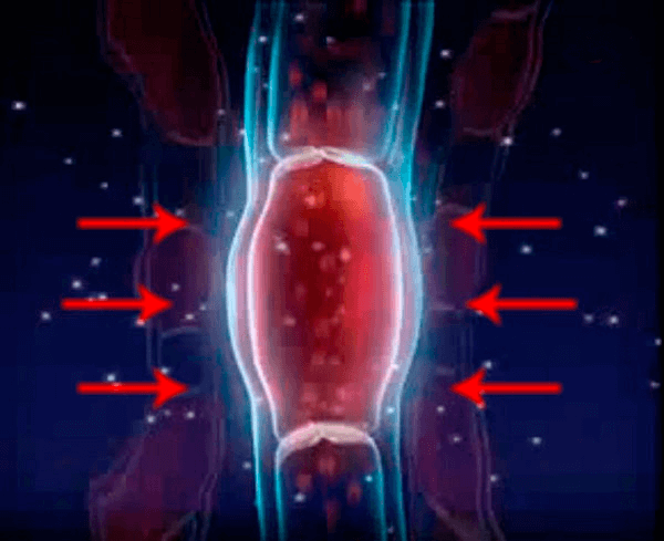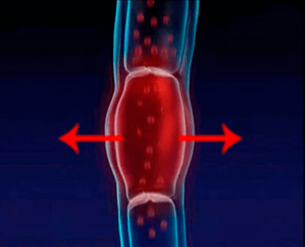 Následný průtok krve zesiluje, krev se vrací do povrchových žil. Tlak v žilách se zvyšuje natolik, že jejich stěny nevydrží a začnou bobtnat jako balón. Můžete to jasně vidět na obrazovce.
