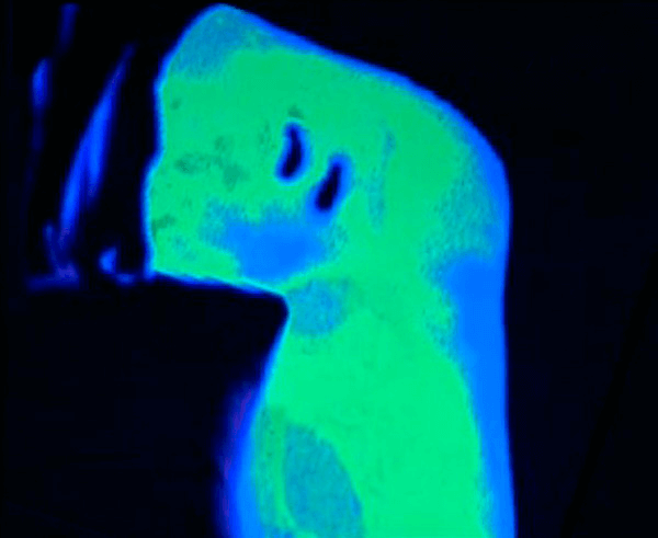 Jedná se o pohled na nohy infračervenou kamerou. Červené tečky jsou problematické, varixy. V těchto místech se hromadí krev; proto jsou zřetelně označena.
